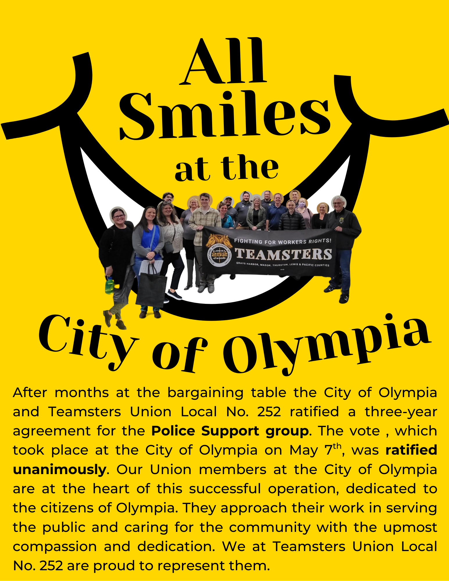 Teamsters Local 252 members at City of Tumwater Public Works have ratified a new three (3) year agreement. The new three (3) year agreement provides historical pay increases, recognition of longevity, has the City paying into the Western Conference of Teamsters Pension Trust, and the City continues to pay 100% full Medical and Benefits for the life of the agreement. This contract greatly benefits 32 Local 252 members and their families.
