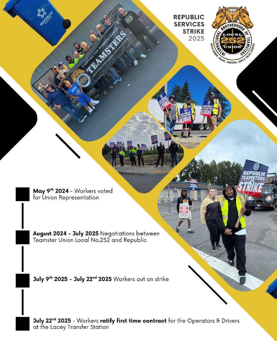 It all started May 9th 2024, when the small group of Republic Services Operators and Drivers at the Lacey WA Transfer Station voted in favor of union representation By Teamsters Local 252.